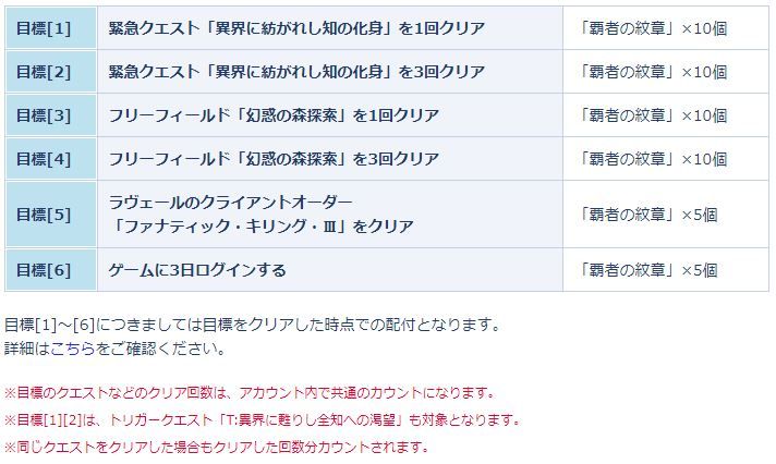 今週のキャンペーンはブーストの発生しているオメガルーサーと幻惑の森のクリアが主ですね。幻惑の森なんかは丸ぐるだけしてクリアせずにテレパで帰っちゃうなんて人も多いと思いますからご注意です。しっかりと魔神城まで倒してクリアカウントなのをお忘れなく。
