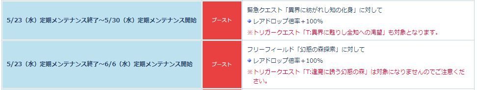 まずはブーストのほうですが、今週はオメガルーサー戦の「異界に紡がれし知の化身」とトリガークエストの「T:異界に甦りし全知への渇望」と常設クエストの「幻惑の森探索」の3つのクエストにおいてレアドロップ倍率+100%といったブーストが発生しております。